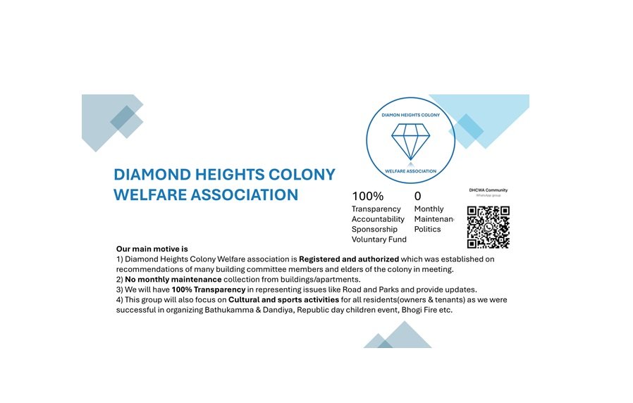 1) Diamond Heights Colony Welfare association is Registered and authorized which was established on recommendations of many building committee members and elders of the colony in meeting.
